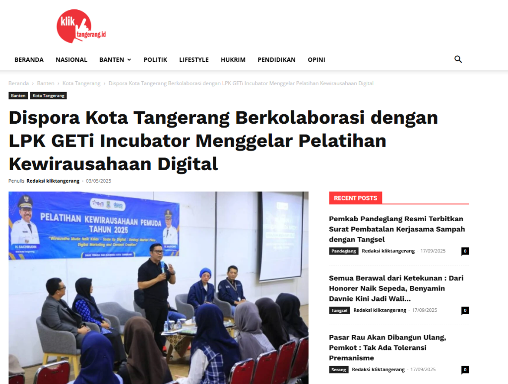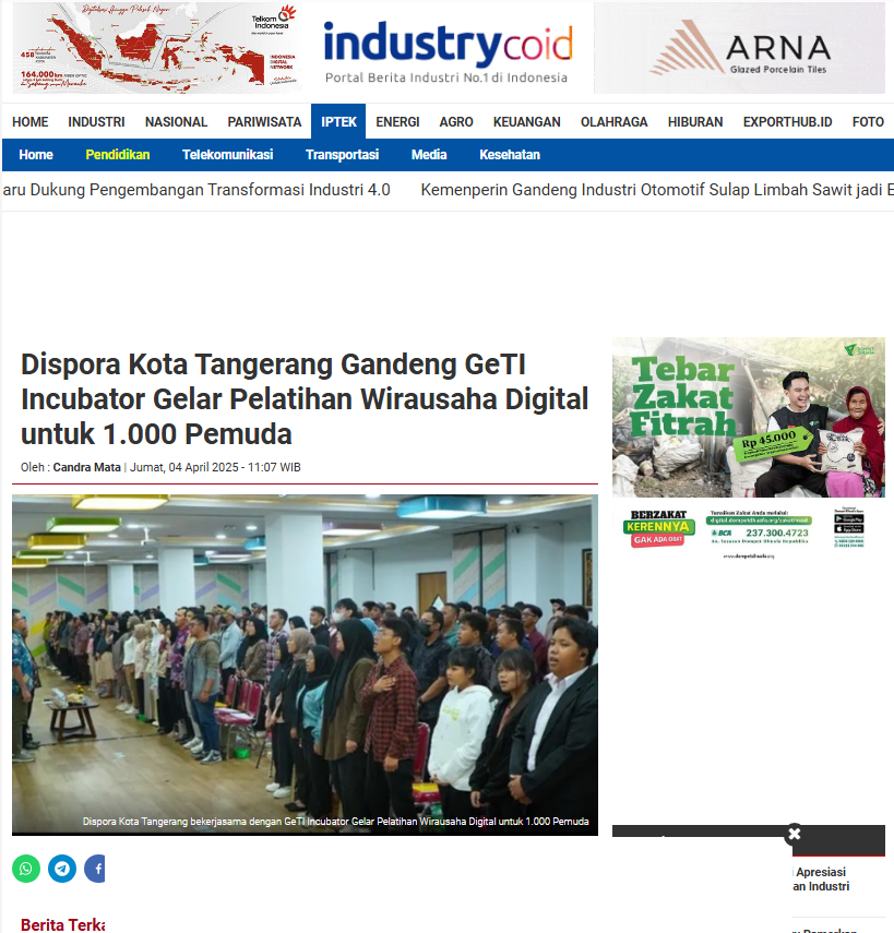 Industry.co.id – Dispora Kota Tangerang Gandeng GeTI Incubator Gelar Pelatihan Wirausaha Digital untuk 1.000 Pemuda